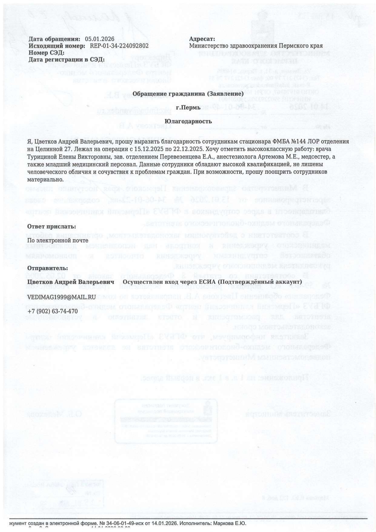 Благодарность ЛОР отделению.