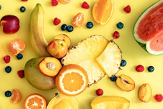 - Фрукты: яблоки, персики, абрикосы, апельсины, грейпфруты, лимоны, виноград, дыня, изюм, сливы, чернослив.