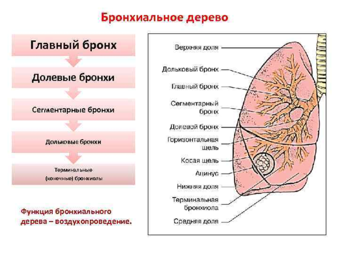 Совокупность всех бронхов, начиная с главного, по которым осуществляется проведение воздуха, называется бронхиальное дерево.