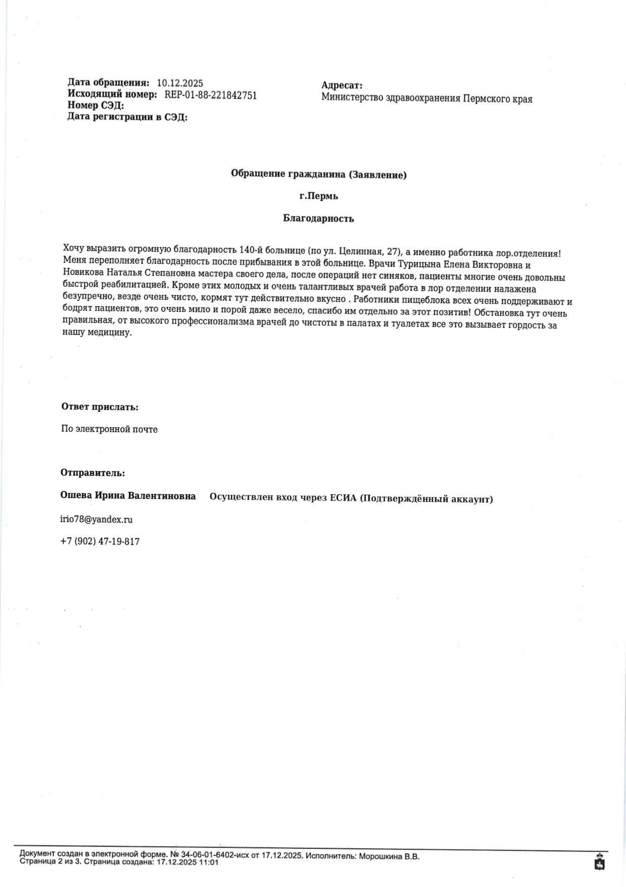 Благодарность от Ошевой Ирины Валентиновны врачам: Турициной Елене Викторовне и Новиковой Наталье Степановне, а так-же всем врачам ЛОР. отделения МСЧ № 140.